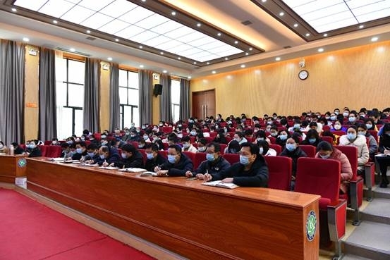 校领导刘培兵、马分产、尚嘉伟、张志强、李小记、李沛分别就分管工作对两个校区教职工作出安排部署。(摄影:郝超男 审核:李建威)