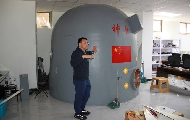 (图为:王华校长为开高校友们介绍航天五院捐赠的神舟飞船返回舱体验模型)