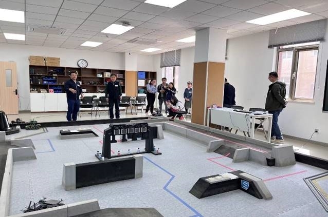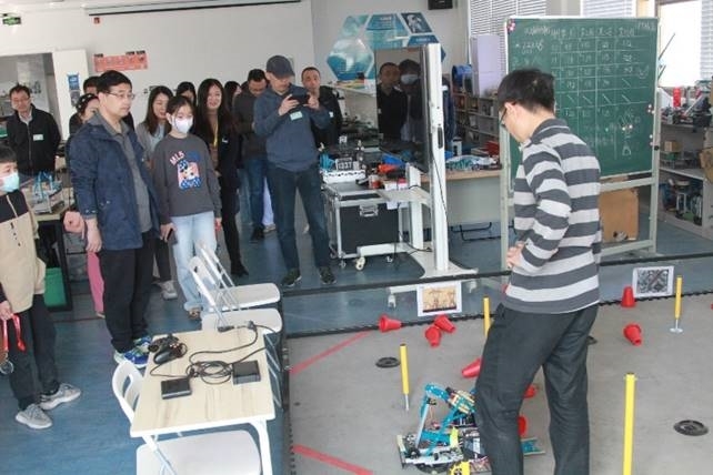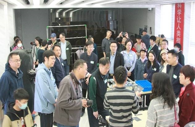(图为:校友们观摩代表中国参加FTC机器人世锦赛DEEY机器人社团和斩获无数的机甲大师项目)