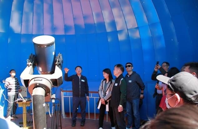 (图为:校友们参观坐落在北师大二附中教学楼顶的专业天文台及同学们拍摄的宇宙天体照片)