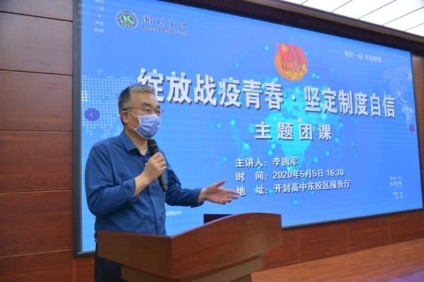 5月5日下午,开封高中“绽放战疫青春坚定制度自信”主题团课在东校区报告厅开课,2021届16个支部的教室同时转播,近千名青年学生参与其中。校团委邀请河南省援鄂医疗队副队长、开封市中心医院EICU主任李拥军先生授课。面对严峻的疫情,援鄂医疗队在最短的时间内迅速集结出击,成立临时党总支,快速全面了解情况、科学做好策划部署,奋勇搏击病毒,最终取得抗疫胜利。李拥军通过大量的视频、图片还原开封医疗队赴鄂抗疫
