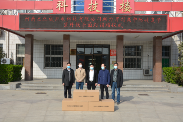 3月13日下午,河南杰之威光电科技有限公司销售经理朱世凯一行向我校捐赠10台紫外线消毒灯,帮助学校共同抗击疫情,副校长马分产代表学校接受捐赠。朱世凯现场为我校工作人员讲解灯具使用方法和注意事项。据他介绍,紫外照射是目前已知的、可以抑制该病毒的有效手段。该公司捐赠的紫外线消毒灯可用于室内空间,能够安全高效地消除空气及家具表面的细菌和病毒。马分产代表学校对杰之威公司支持学校,支持教育,勇担社会责任的义