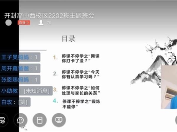 为在疫情期间也能与学生有效地进行学习与生活上的沟通,3月15日晚上,开封高中西校区2022届各班班主任组织开展线上网络班会,拉近学生与学生、学生与教师之间的距离。本次线上班会由班长或团支书主持,各班班主任、学生与家长共同参与,通过视频的方式进行了多方面的沟通与交流。在班会中,同学们交流了居家学习心得体会、学习上遇到的困难以及解决的方法措施。班主任也给同学们提出了疫情期间停课不停学的“三个建议”:发挥优势