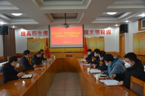 2020年1月28日下午,我校召开新型冠状病毒疫情防控工作专题会,开封高中党委书记耿振勇,副校长宋全会、尚嘉伟、校务委员王新国、李沛,师训处主任毛广文、总务处副主任王双虎、综合办副主任马珂、王文昊,高三年级副主任刘冉参加了会议,会议由耿振勇同志主持。会上,耿振勇带领与会人员再次学习了近阶段有关疫情防控的上级重要文件,肯定了前阶段各处室、各年级配合学校所做的工作,表扬了医务室、总务处提前准备了疫情防疫物资