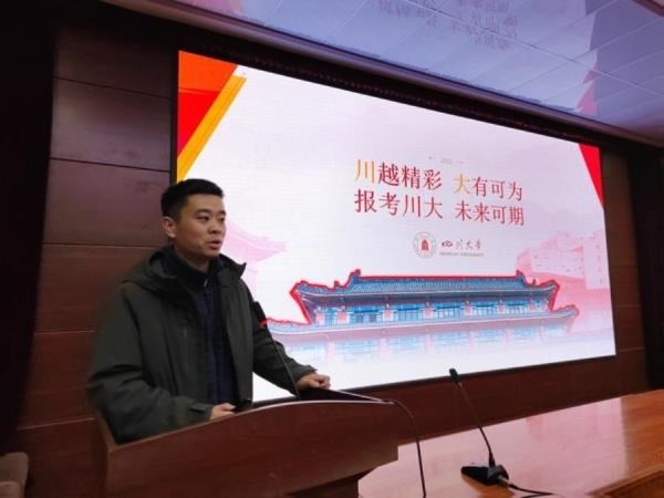 2023年12月25日,四川大学河南省招生工作组组长张大伟教授、招生联络员唐霞博士及招生专员孔祥阁博士莅临我校,进行高校宣讲活动。开封高中副校长马分产、督导室主任苏新明进行了热情的接待。晚上七点,在开高东报告厅,家长们提前来到会场参加本次宣传活动,会议由苏新明主持,张大伟教授主讲。四川大学是教育部直属、中央直管副部级的全国重点大学;位列国家211工程、985工程、世界一流大学建设高校(A类),是国