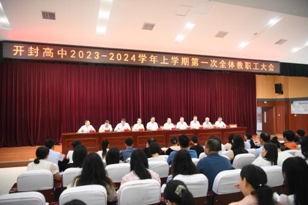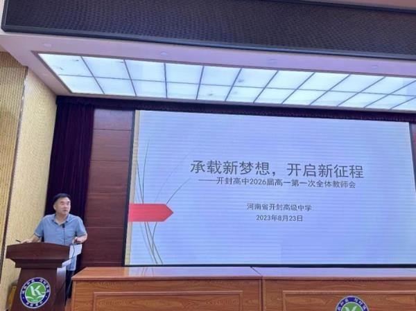 云天收夏色,木叶动秋声。新起点承载新梦想,新目标开启新征程。为使新学期起好步、开好局,确保26届教育教学各项工作扎实有序展开,8月23日下午,开封高中东校区2026届高一第一次全体教师会圆满召开。教务处主任周金陈提纲挈领,首先结合新高考形式与我省我校高考数据为高一年级制定了高一全年目标,接着分别对新学年的教学与教师工作提出了详实确切的要求。他指出,在教学方面,各学科组长要肩负职责,带动学科工作有条