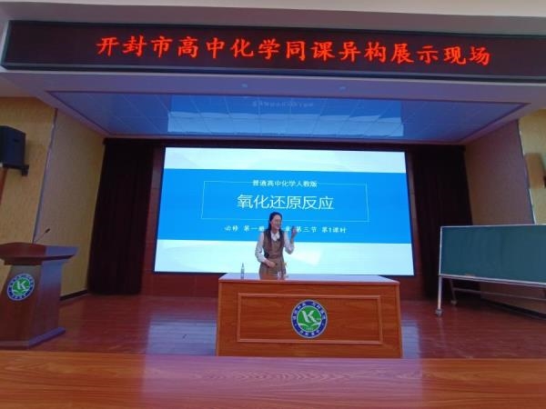 教无止境,研无止境。为了进一步优化课堂教学,提升教师的专业素养,促进教师相互学习,相互交流,2023年5月9日全市高中化学教师共赴开封高中参加了高中化学同课异构展示活动。刚刚荣获河南省化学优质课一等奖的开封高中林芳老师和河大附中王瑞欣老师分别就“氧化还原反应”进行展示。本次活动由省级学科基地负责人、开封高中化学教研组长郭宏强老师主持。 林芳老师在执教过程中抑扬顿挫、娓娓道来,举止大方的教态让