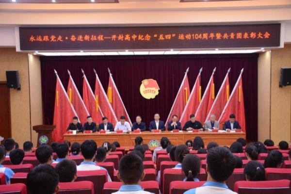 5月4日下午16:20分,开封高中纪念“五四”运动104周年暨共青团表彰大会在东校区东报告厅举行。我校30周岁以下青年教师,各学生支部团支书、班长及获奖学生代表悉数参加。现场与会领导有开封高中校长宋全会,党委副书记、副校长刘培兵,副校长马分产、尚嘉伟、张志强,校务委员王新国、荣海洋、李沛。大会由校团委书记苗森主持。尚嘉伟宣读《关于表彰2022年度开封高中先进团组织和个人的决定》,林芳等32位青年教