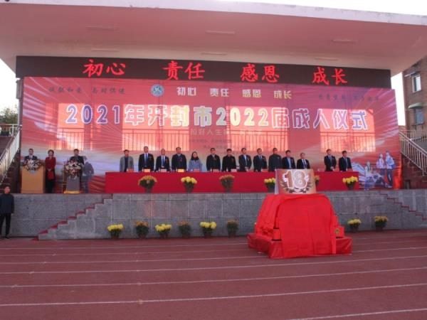 2021年10月17日上午8:30,由开封市文明办、开封市教育体育局、共青团开封市委员会主办,开封高中承办的以“初心 责任 感恩 成长”为主题的2022届学生成人仪式活动在开封高中东校区体育场盛大举行。