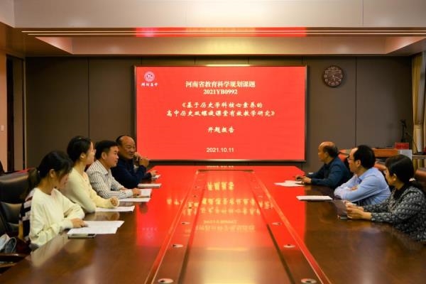 查看详情2021年10月11日,河南省教育科学“十四五”规划立项课题《基于历史学科核心素养的高中历史双螺旋课堂有效教学研究》课题组在开封高中东校区行政楼四楼会议室开展课题研究活动。本次活动由开封高中副校长、课题组主持人马分产主持,课题组韩艳明、徐志愿、陈其龙等全体成员、课题评议专家李宝珠、赵旺海参加了此次研究活动。课题组主持人马分产老师首先对“历史学科核心素养”和“双螺旋课堂”教学做了简要介绍。并由课题组