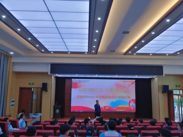 春风十里,书墨飘香。为大力弘扬中华优秀文化,进一步丰富校园文化生活,营造浓厚的书香校园氛围,激发学生的读书和诵读热情,9月29日下午16:15分,开封高中2021年迎国庆古诗文朗诵比赛在东报告厅举行。